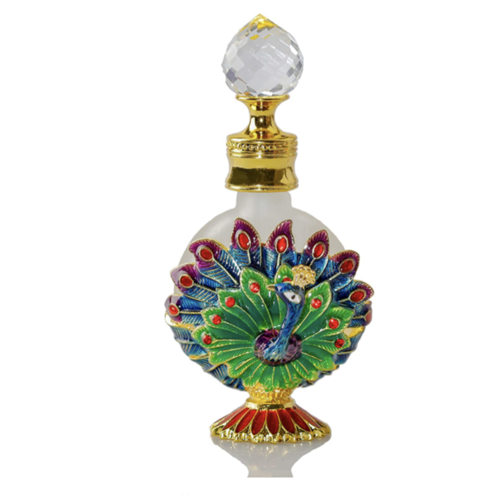 Frosted White Bottle with Green & Blue Peacock Anointing oil bottle